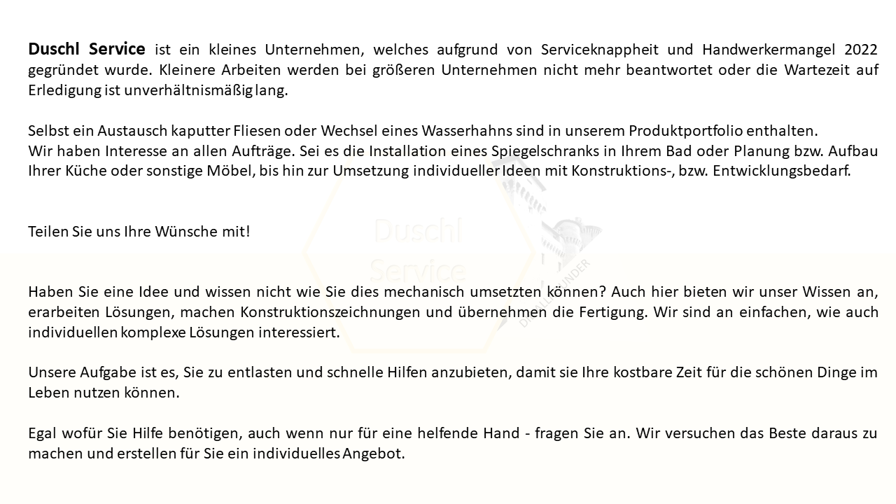 ... ist ein kleines Unternehmen, welches aufgrund von Serviceknappheit und Handwerkermangel 2022 gegründet wurde. Kleinere Arbeiten werden bei größeren Unternehmen nicht mehr beantwortet oder die Wartezeit auf Erledigung ist unverhältnismäßig lang. Aufgrund unseres breiten Netzwerkes können wir fast alles anbieten.